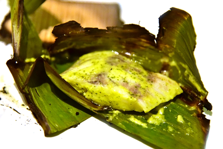 19th course : Cedar Wood Paturi – เนื้อปลากระพงเผาใบตองจุดไฟจนหอมฉุย เนื้อปลากระพงนุ่มนิ่มเข้ากับซอสพริกน้ำมันมัสตาร์ดรสเข้มข้นสุดๆ ฟิน