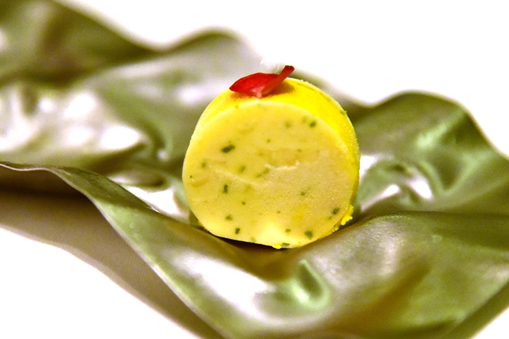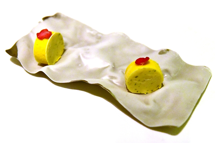 2nd course : Yogurt Explosion – “ระเบิดโยเกิร์ต” ในรูปของเจลลี่สอดไส้ซอสโยเกิร์ตเข้มข้น เมนูนี้คือเมนูประจำที่เชฟ Gaggan จะคงไว้ให้อยู่ที่คอร์สเสมอ