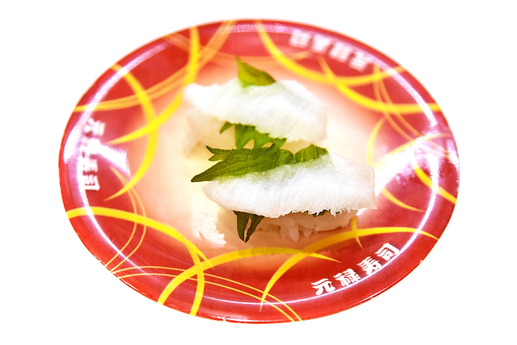 2. Flounder Edge Sushi (125 Yen) – ซูชิหน้าครีบปลาตาเดียวและใบโอบะ