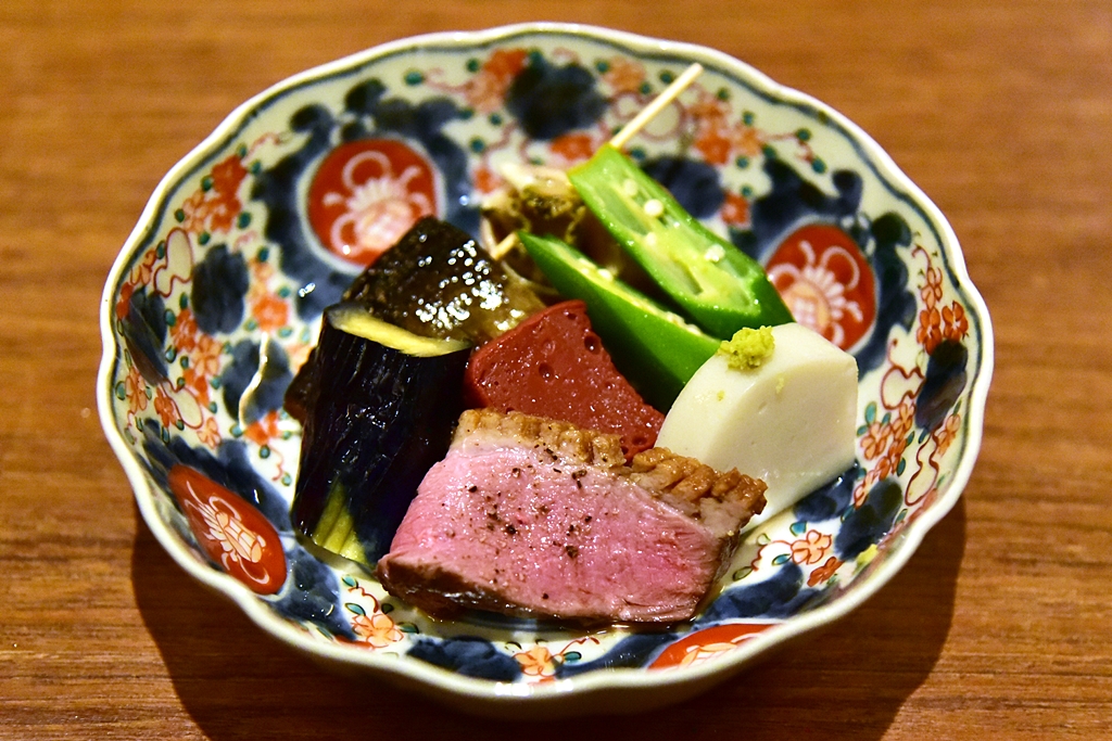 6th course: Chef’s Special – เซ็ตอาหารจานพิเศษของเชฟที่ประกอบไปด้วยเนื้ออกเป็ด ปลานิชินย่าง ลูกชิ้นปลาเนื้อเด้ง หอยสังฑ์ญี่ปุ่น กระเจี๊ยบ มะเขือม่วงและบุก