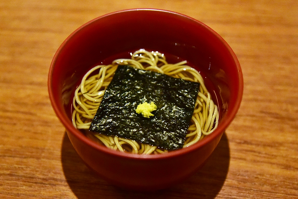 4th course: Hot Soba – โซบะร้อนในน้ำซุปใสรสชาตินุ่มนวลเสิร์ฟคู่กับสาหร่ายหอมๆและวาซาบิ
