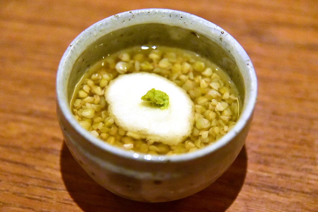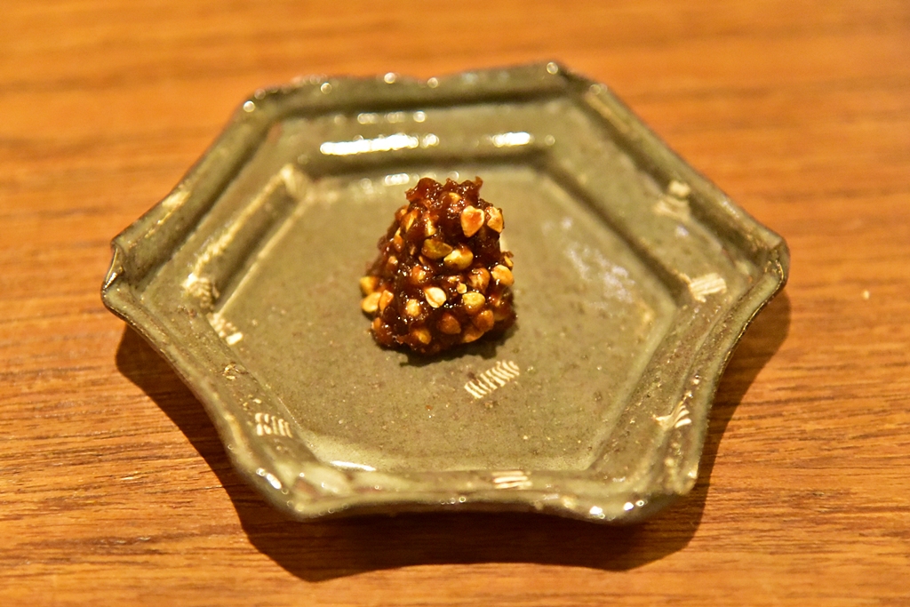 1st course: Soba Miso – เมล็ดโซบะกรุบกรอบผสมกับมิโสะรสเข้มข้นหอมอร่อยเข้ากัน