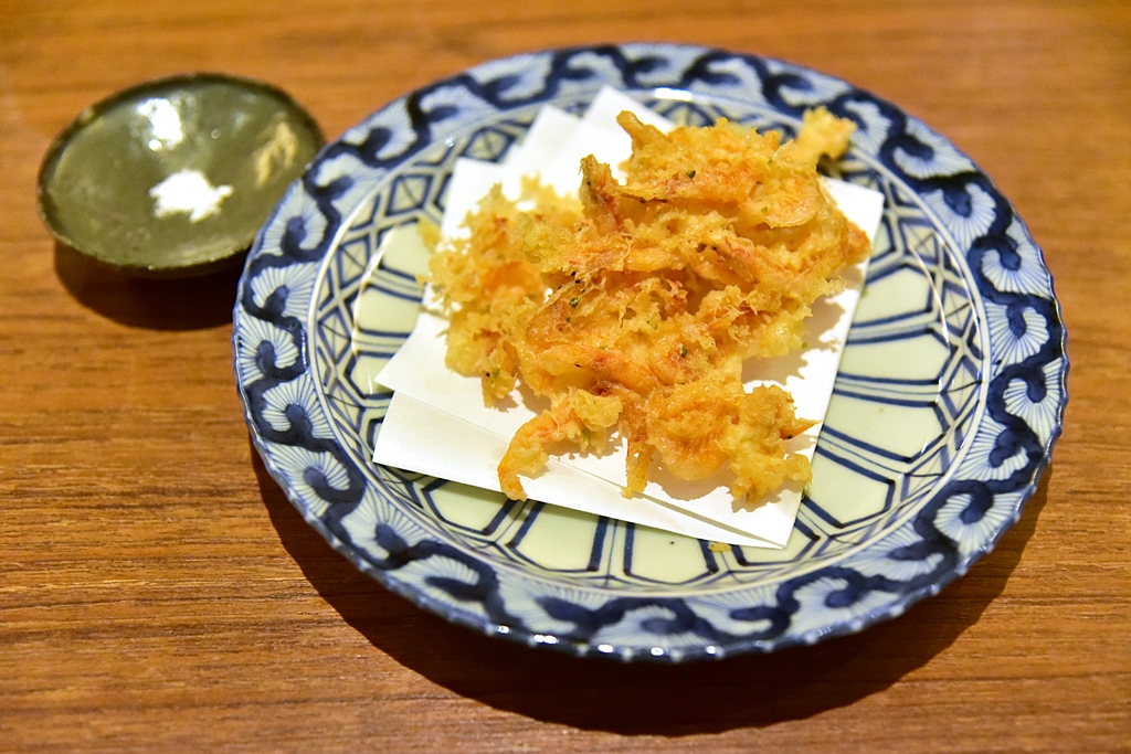 7th course: Sakura Ebi Tempura – เทมปุระกุ้งซากุระตัวจิ๋วทอดกรอบเสิร์ฟคู่กับเกลือญี่ปุ่นรสเด็ด โคตรอร่อย !!