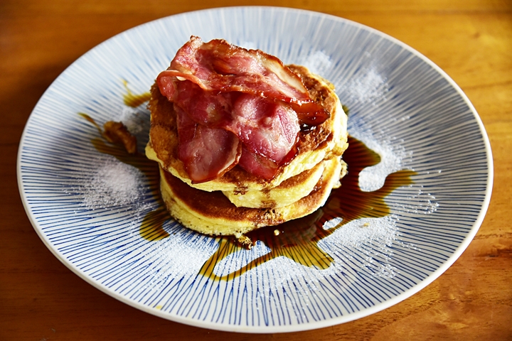 1. Palm Sugar Pancakes (Rp. 87.000) – แพนเค้กเนื้อนุ่มเสิร์ฟคู่กับกล้วยเชื่อม วอลนัทและเบค่อนกรอบ
