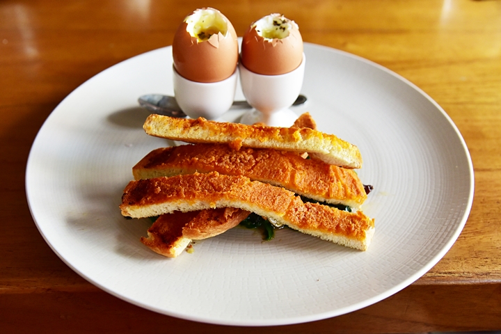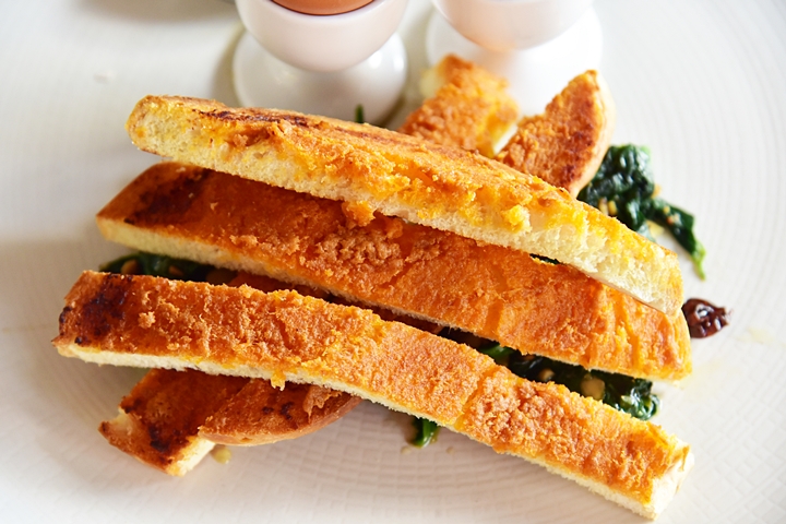 3. Sobrasa Soldiers (Rp. 88.000) – ขนมปังซอร์โดปิ้งหั่นเป็นชิ้นเสิร์ฟคู่กับไข่ต้มและผัดผักโขมผสมอัลมอนด์