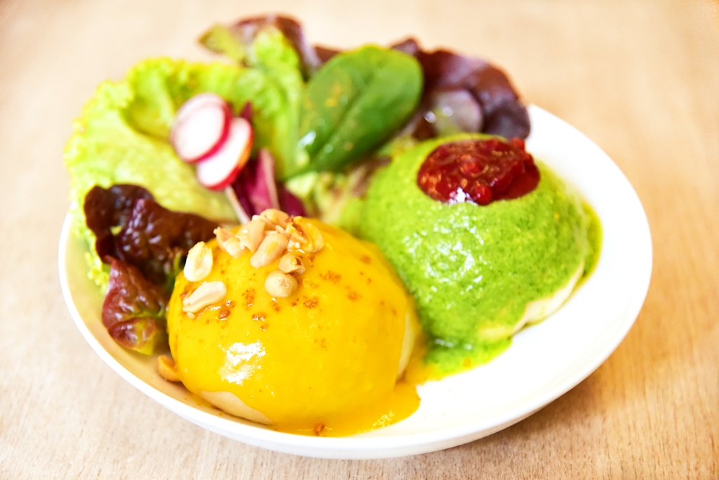 1. Ben & Barbel (9.00 EURO) – ซาลาเปาไส้มัสมั่นเต้าหู้กับซอสมะม่วงมะพร้าวสีเหลืองสดใสและซาลาเปาไส้ชีสนมแพะน้ำผึ้งกับซอสเพสโต้มะม่วงหิมพานต์และแครนเบอร์รีที่เข้ากันได้ดี อร่อยมากทั้งสองลูก !!