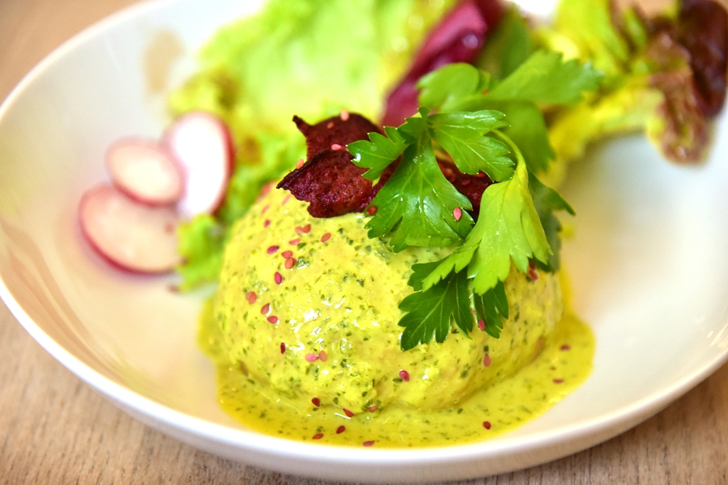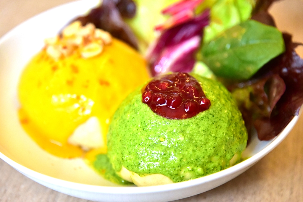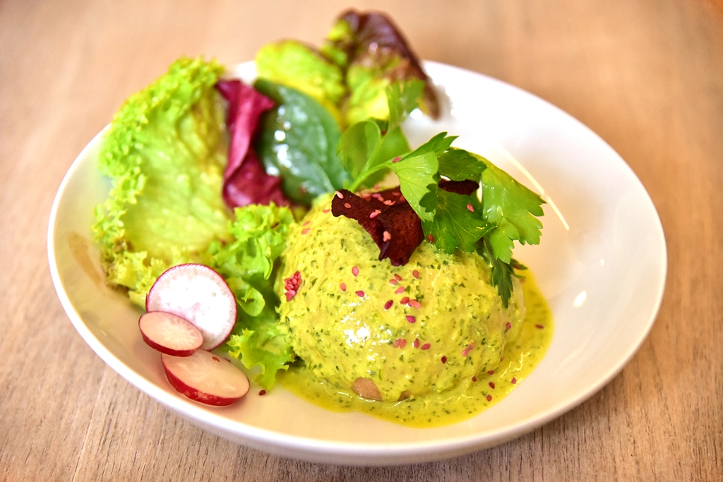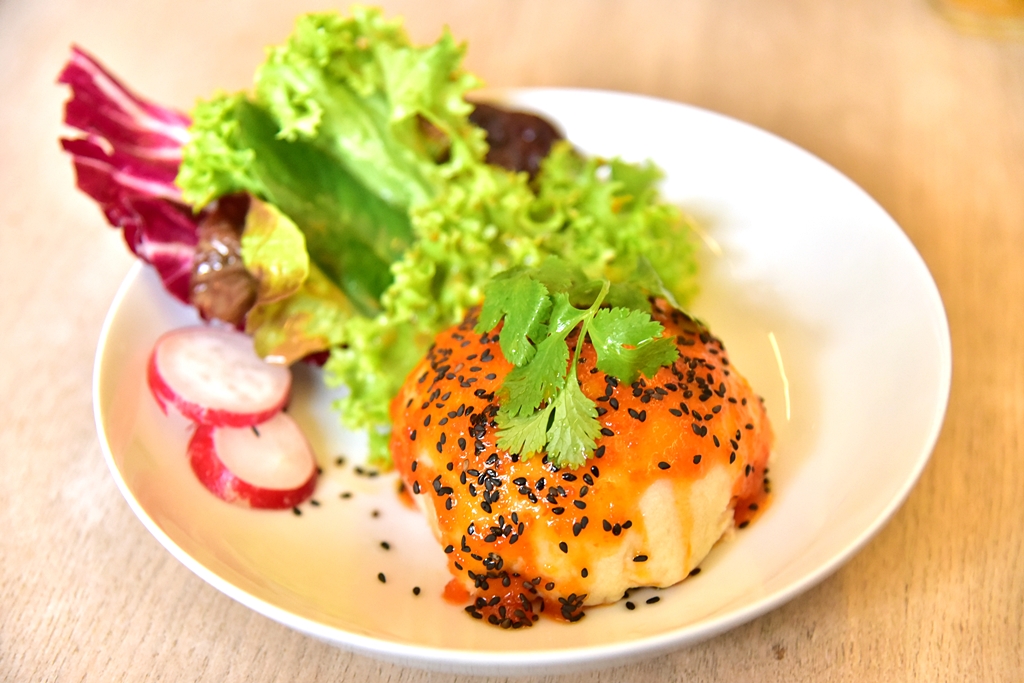 2. Sophia (4.50 EURO) – ซาลาเปาสอดไส้เห็ดผัดมิโสะพร้อมด้วยซอสเพสโต้กับบีทรูทชิป