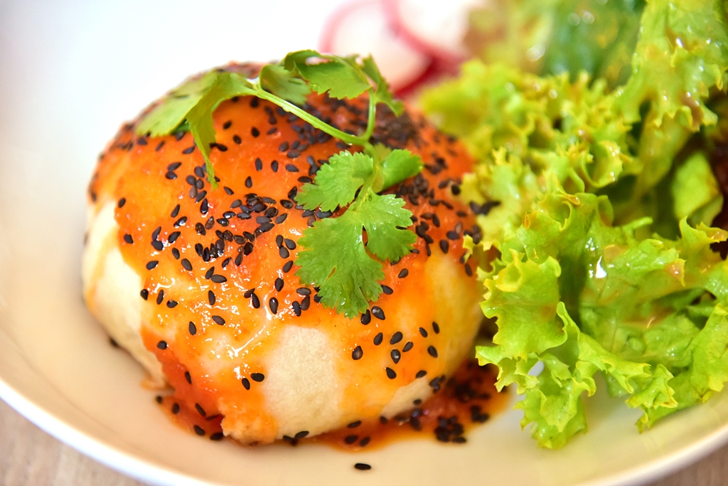 3. Mathias (4.50 EURO) – ซาลาเปาสอดไส้เนื้อเจผัดซอสพริกโรยหน้าด้วยงาดำ