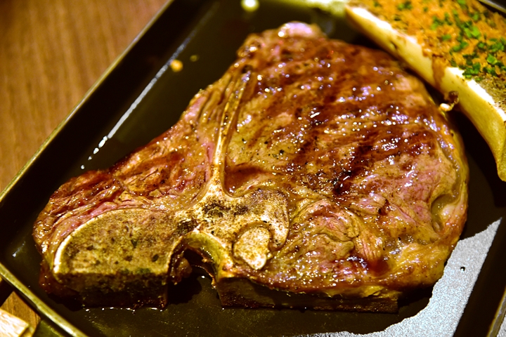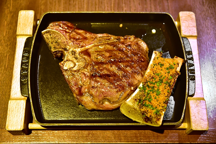1. USDA Dry Aged Rib on the Bone 400g (34 GBP) + Roast Bone Marrow (3 GBP) – สเต็กเนื้อริบอายติดกระดูกดรายเอจ 40-60 วันเสิร์ฟคู่กับไขสันหลังวัวย่างเนื้อนุ่ม