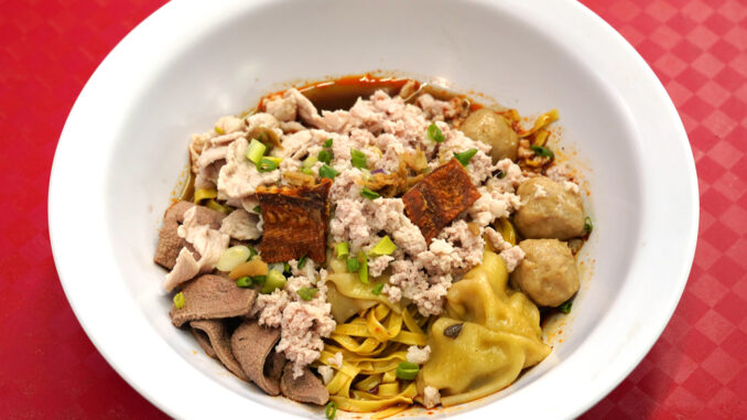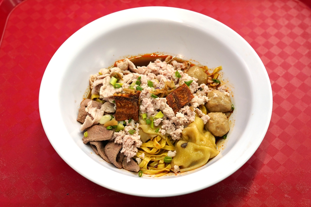 3. Gan Mian (10 SGD) [15/20] – บะหมี่เส้นแบนแห้งเหยาะซอสเปรี้ยวกับเครื่องแน่นๆทั้งหมูชิ้น หมูสับ ลูกชิ้นหมู ตับหมู เกี๊ยวและปลาเค็มกรอบ ตัวบะหมี่เส้นหนึบดีงามมาก ส่วนรสชาติที่ออกเปรี้ยวๆนั้นก็แล้วแต่คนชอบครับ
