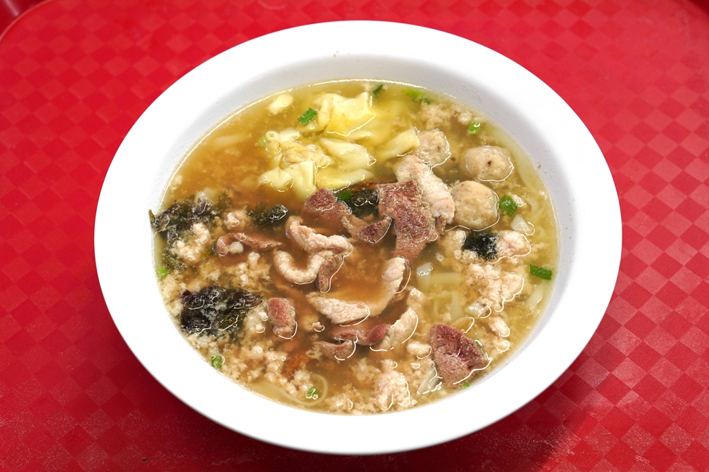 2. Guo Tiao Tang (10 SGD) [14/20] – ก๊วยเตี๋ยวเส้นแบนในน้ำซุปกับเครื่องแน่นๆทั้งหมูชิ้น หมูสับ ลูกชิ้นหมู ตับหมู เกี๊ยวและปลาเค็มกรอบ ตัวซุปกลมกล่อมดี ตัวเส้นออกไปทางเละๆครับ