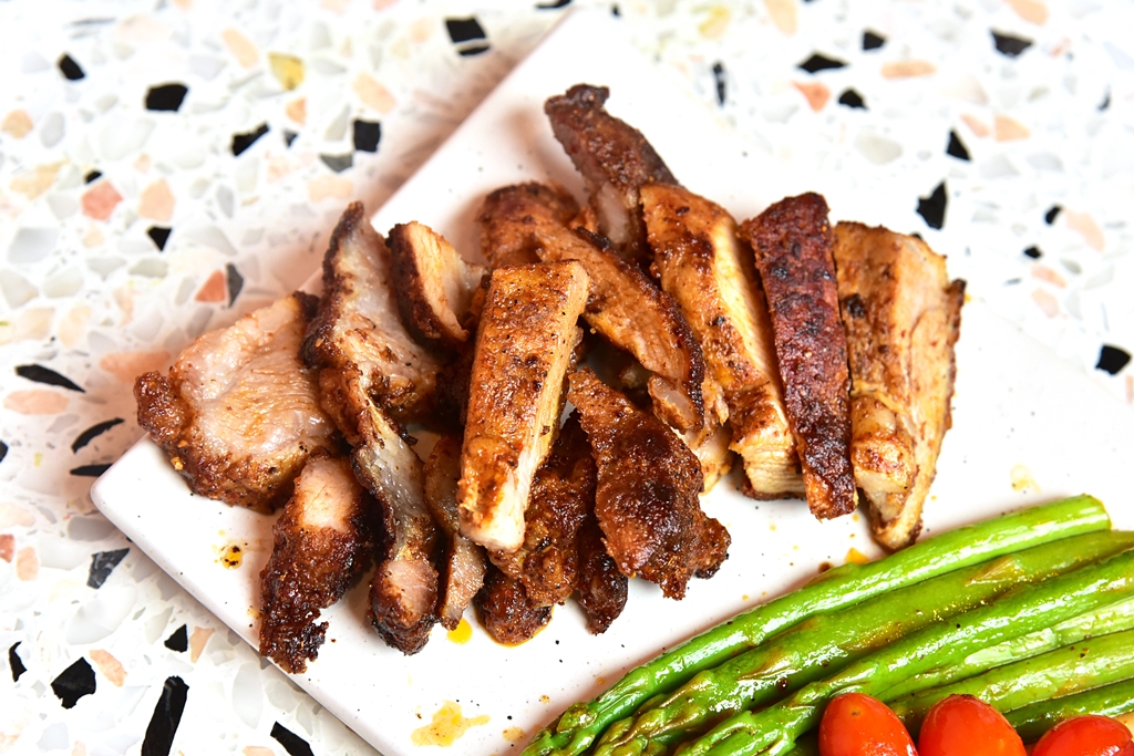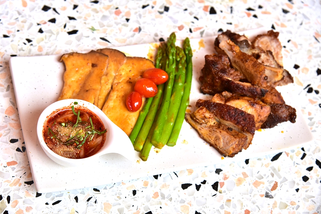 2. Grilled Kurobuta with Mala Sauce (370++ THB) – เนื้อหมูคุโรบูตะพริกหมาล่าย่างเสิร์ฟคู่กับหน่อไม้ฝรั่งและเห็ดออรินจิ