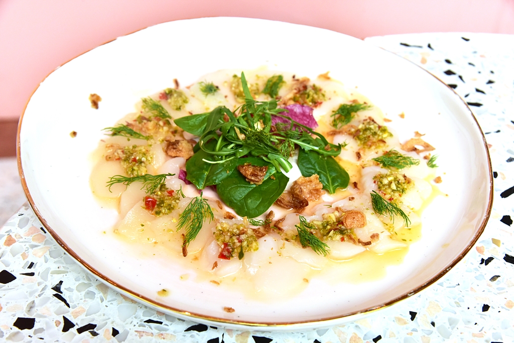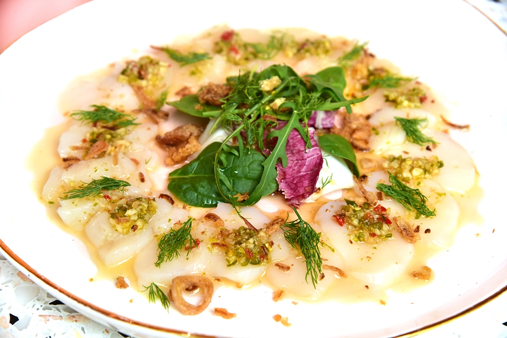 1. Scallops Carpaccio (340++ THB) – หอยเชลล์ดิบเสิร์ฟคู่กับน้ำยารสแซ่บเสิร์ฟคู่กับผักสลัดสีสันสดใส