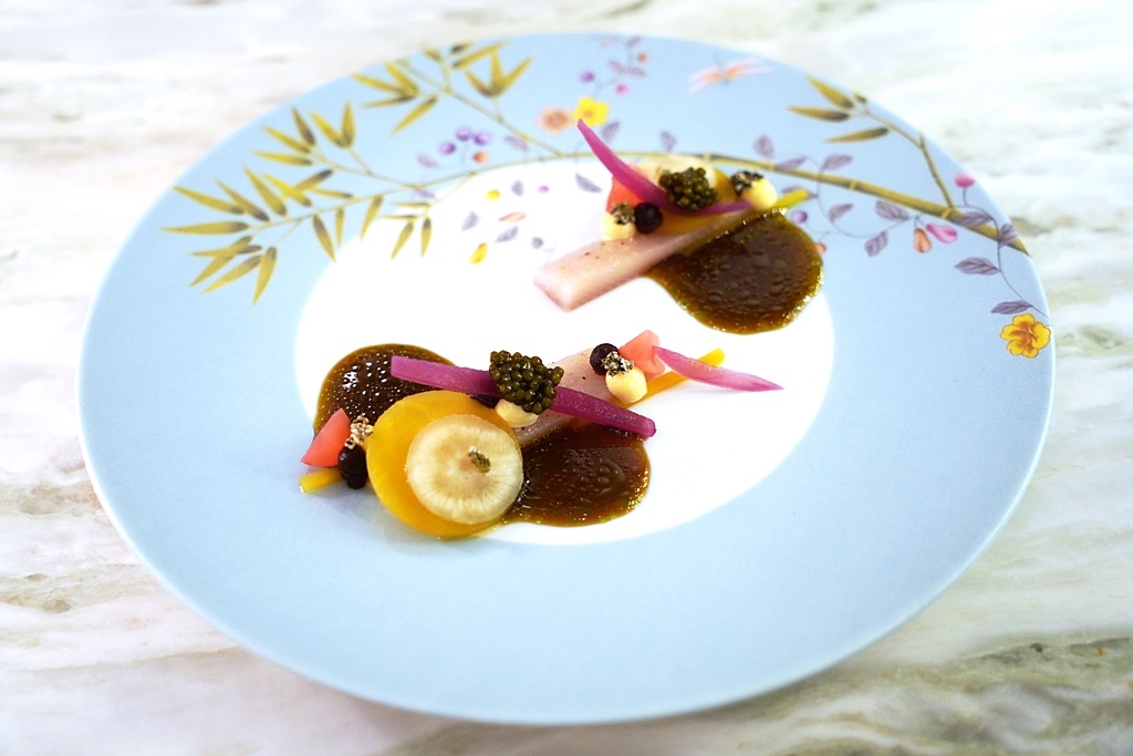 Trout – Picklerd – Ponzu [16/20] – เนื้อปลาเทราท์เสิร์ฟในซอสพอนสึรสกลมกล่อมพร้อมด้วยไข่ปลาคาเวียร์และผักดองหลากชนิด