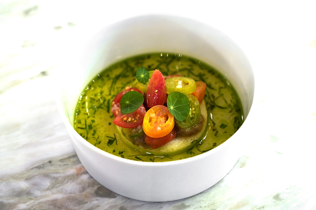 Origin Farm Tomatoes [14/20] – มะเขือเทศเนื้อหวานสดวางบนแตงซุกกีนีเสิร์ฟในน้ำซุปมะเขือเทศอุ่นๆ