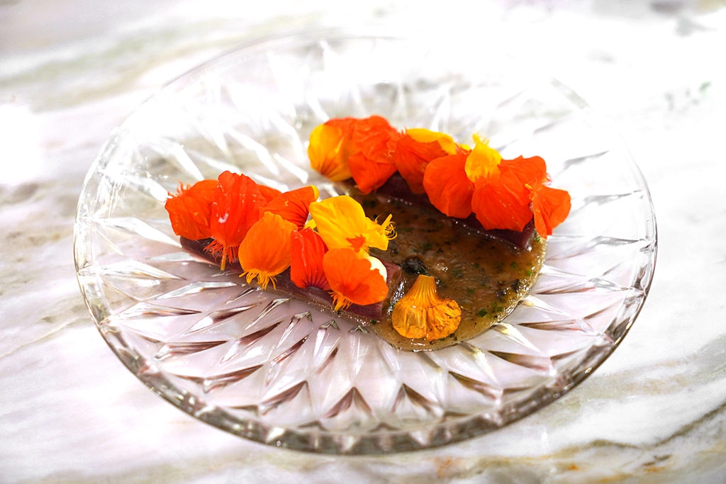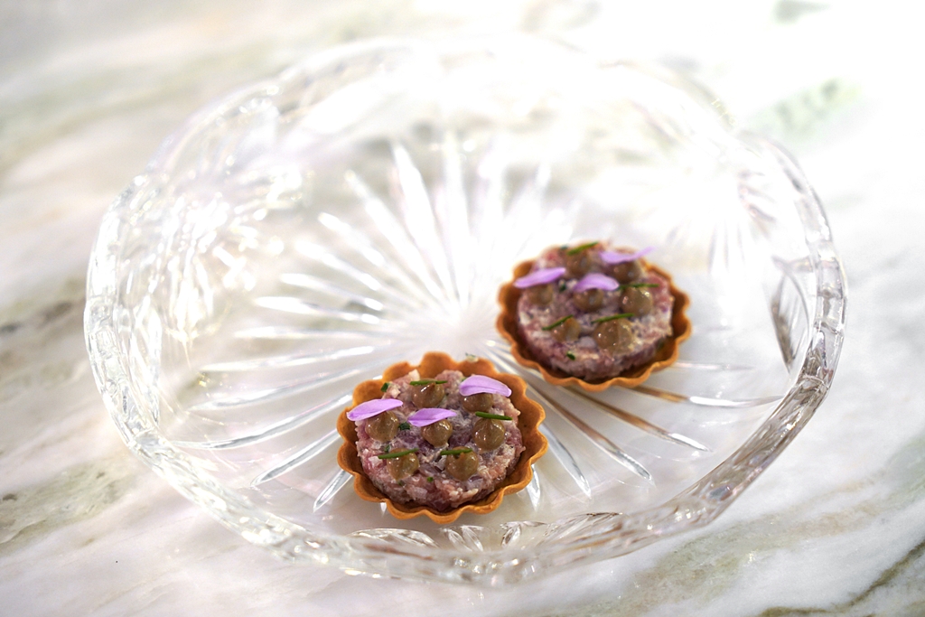 Wagyu Beef Roll – Truffle – Spring Flowers [16/20] – โรลเนื้อวากิวทาร์ทาร์ปรุงรสด้วยเห็ดทรัฟเฟิลได้อย่างดีงามเสิร์ฟคู่กับดอกไม้ทานได้และมันฝรั่งทอด