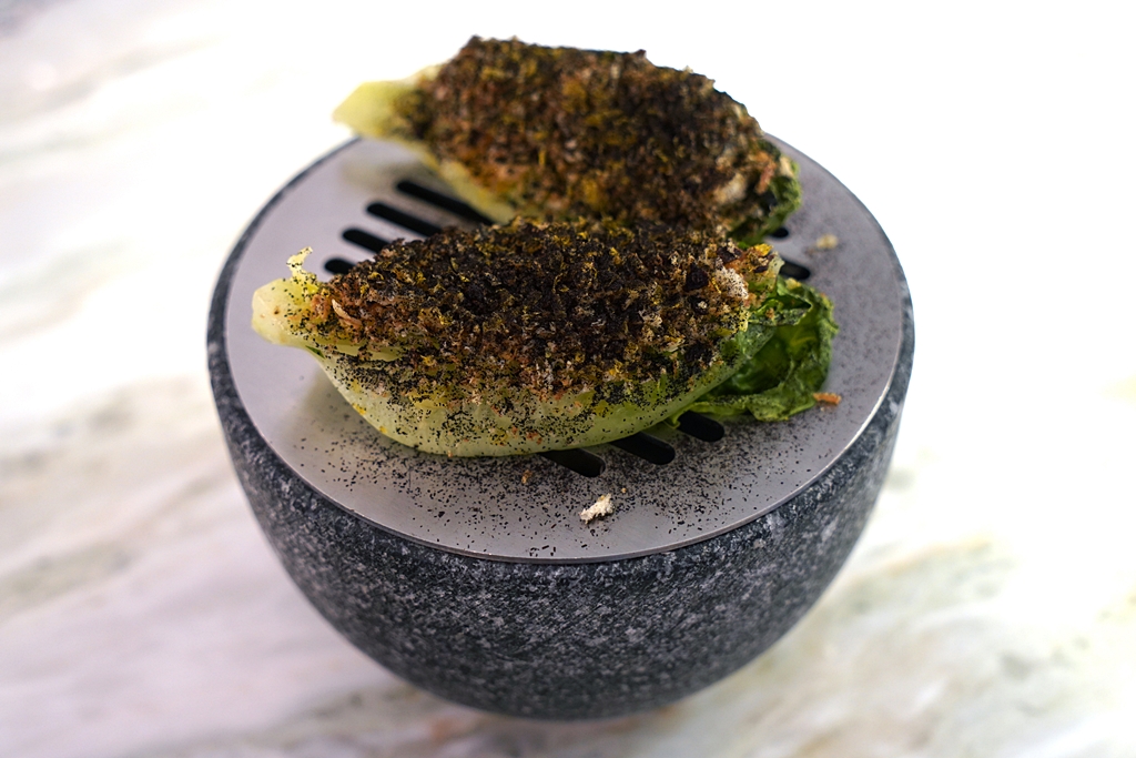 Lettuce – Burnt Leek – Egg Yolk – Smoked [15/20] – ผักกาดสดกรอบปรุงรสด้วยต้นหอมย่างและไข่แดงฝอยรมควัน