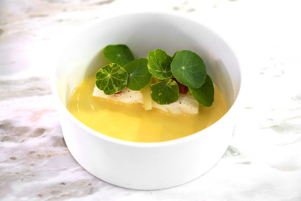 Halibut [16/20] – เนื้อปลาฮาลิบัทสีขาวเนียนเสิร์ฟในซอสเบอบลองค์ซัฟฟร่อนรสกลมกล่อมหอมละมุนคู่กับผักดอง ถือเป็นเมนูเซอร์ไพรส์ที่กลับเป็นเมนูแบบคลาสสิคที่อร่อยมาก
