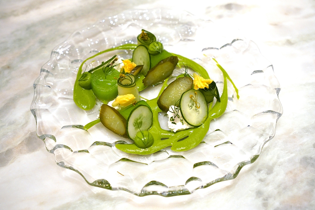 Cucumber – Tomatillo – Dill – Goat Cheese [15/20] – แตงกวาหลากรสสัมผัสเสิร์ฟคู่กับโทมาทิลโล่ ผักชีลาวและชีสนมแพะ