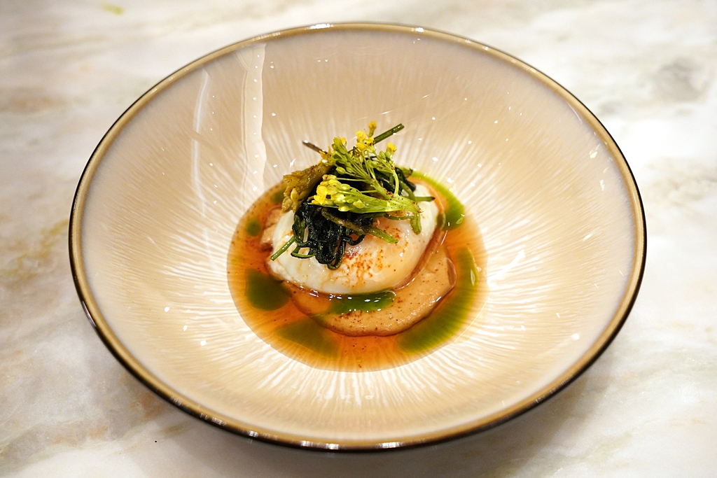 Egg – Ponzu – Morning Glory [16/20] – ไข่ไก่แบบปรุงสุกกำลังดีเนื้อเนียนหนืดเสิร์ฟในซอสพอนสึพร้อมด้วยผักบุ้ง