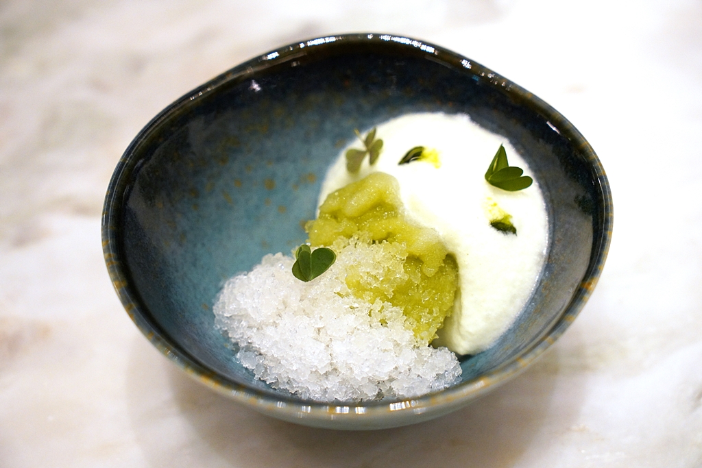 Cucumber [16/20] – ซอร์เบต์แตงกวารสชาติเย็นชื่นใจเสิร์ฟคู่กับครีมเนื้อเนียนนุ่มและเกล็ดน้ำแข็ง