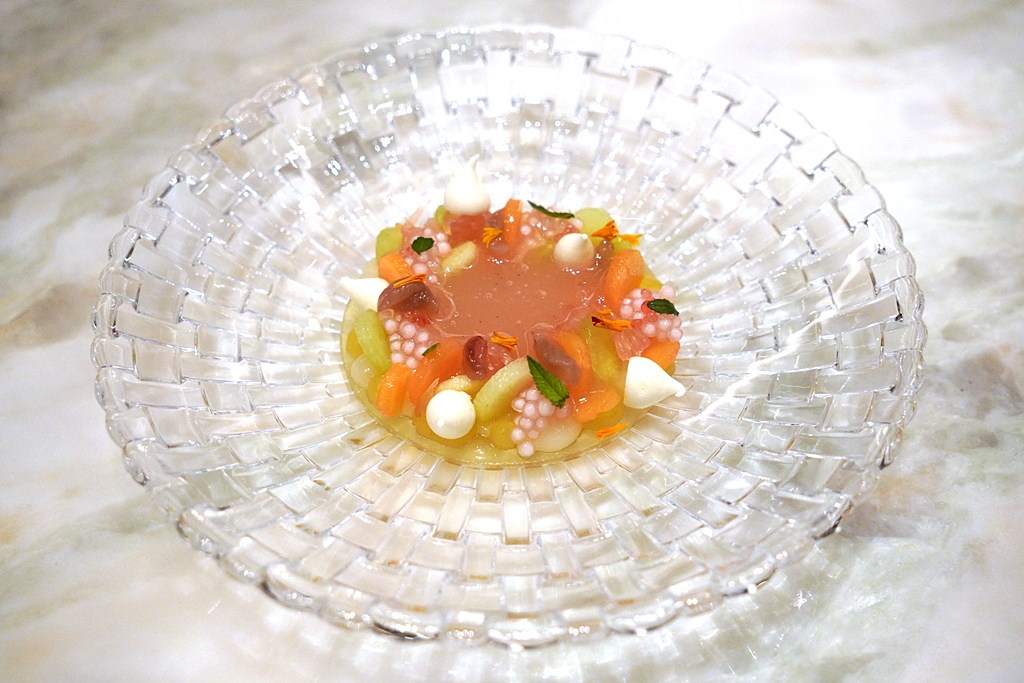 Melon – Mint – Pomelo [13/20] – สลัดผลไม้หลากชนิดเสิร์ฟแบบของหวานพร้อมด้วยเม็ดสาคูและซอสส้มโอ