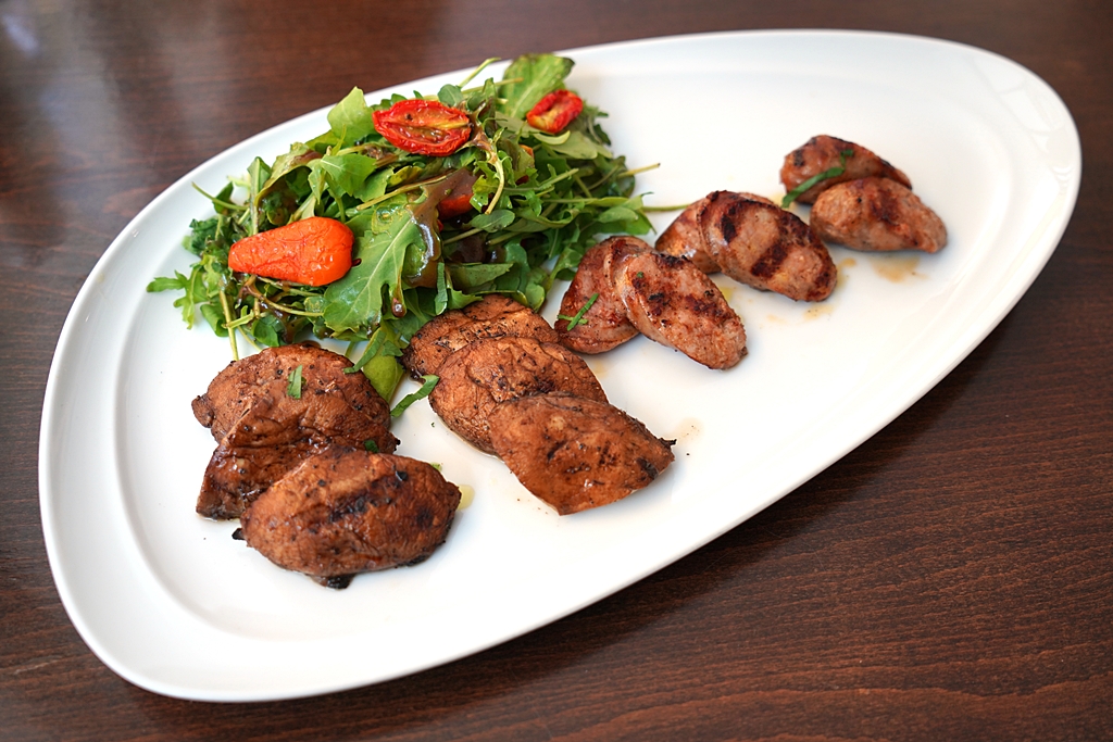 1. Grilled Portobello Mushroom with Italian Sausage and Rocket (550++ THB) [13/20] – เห็ดพอร์โตเบลโลย่างเนื้อฉ่ำเด้งเสิร์ฟกับไส้กรอกหมูและสลัดผักร็อกเก็ตมะเขือเทศอบแห้ง