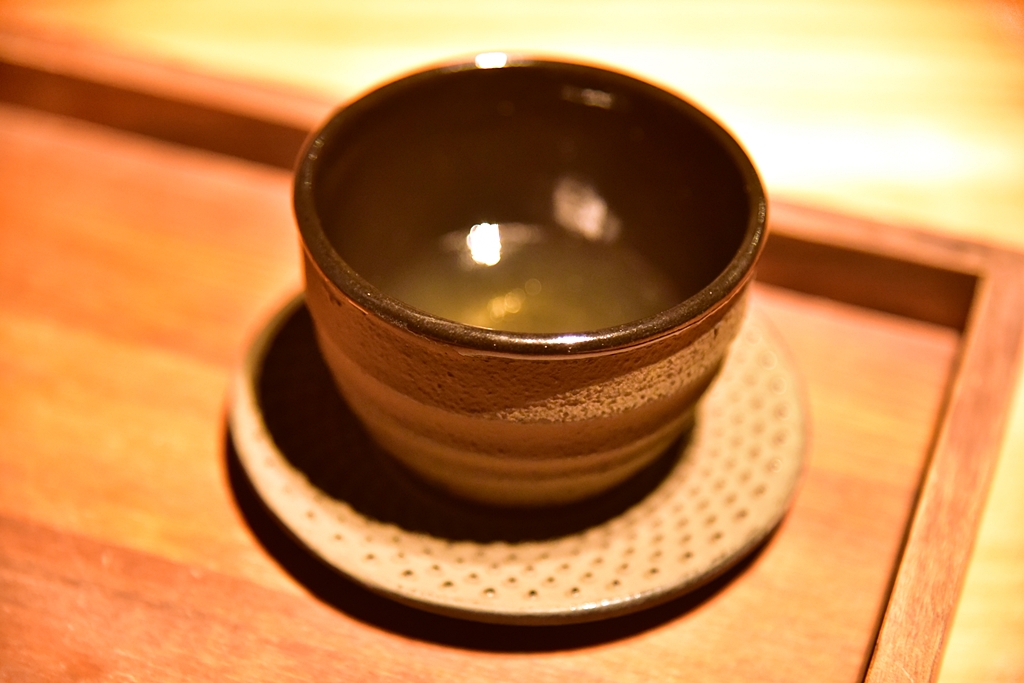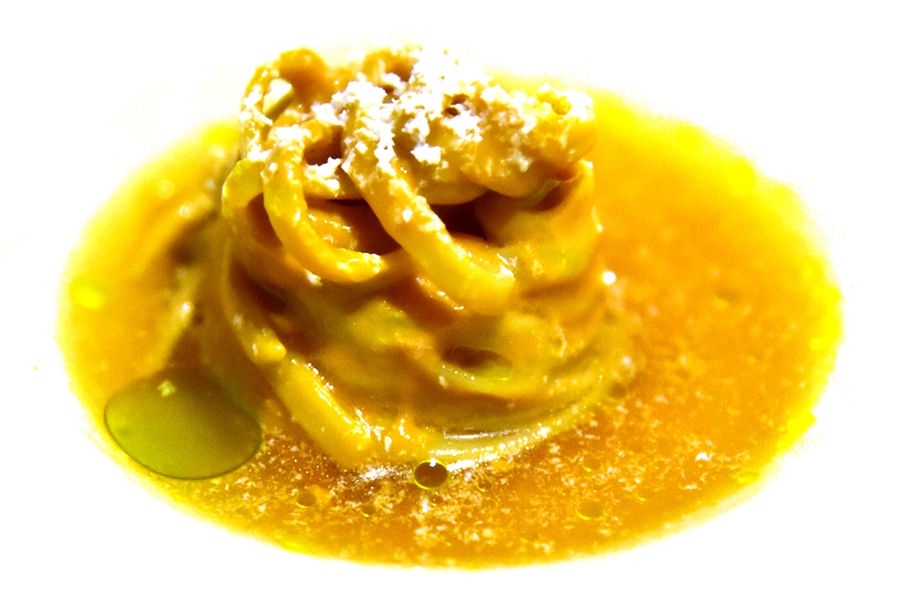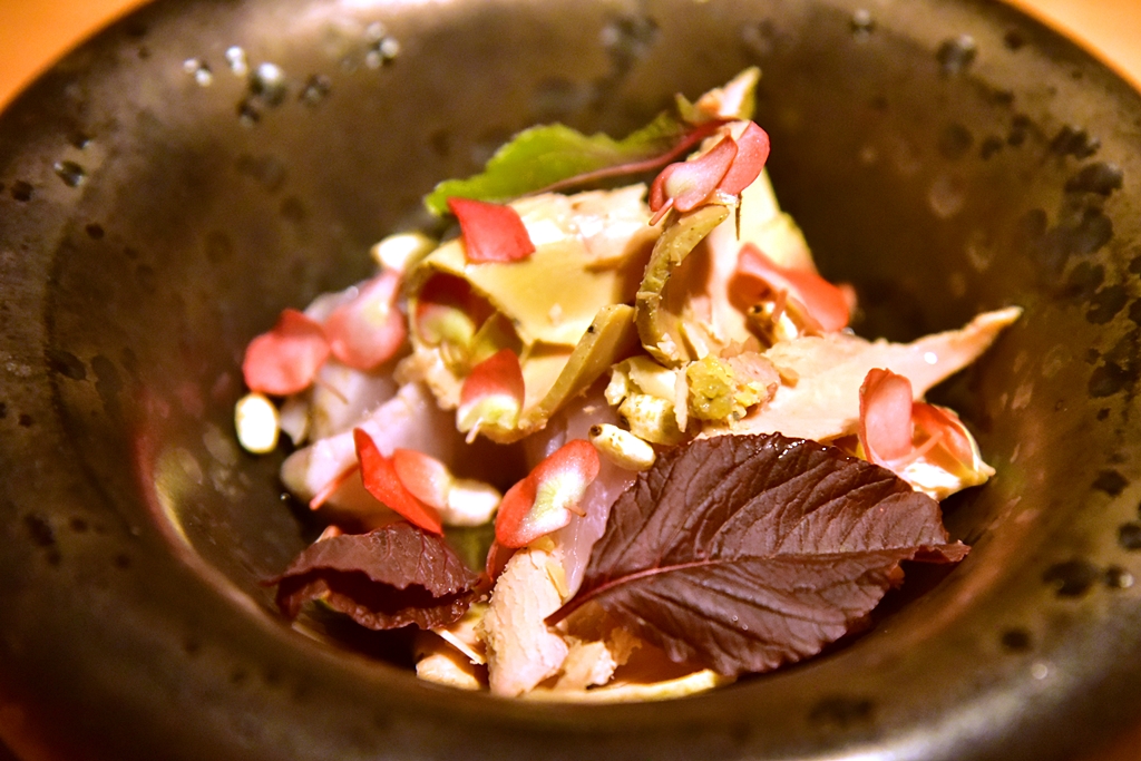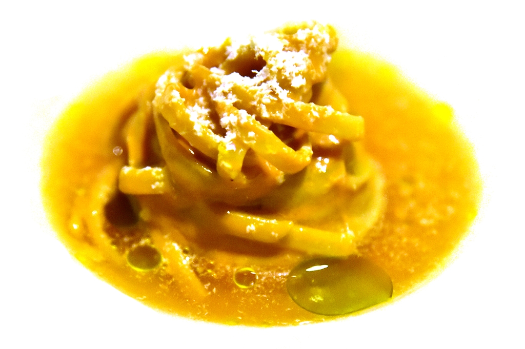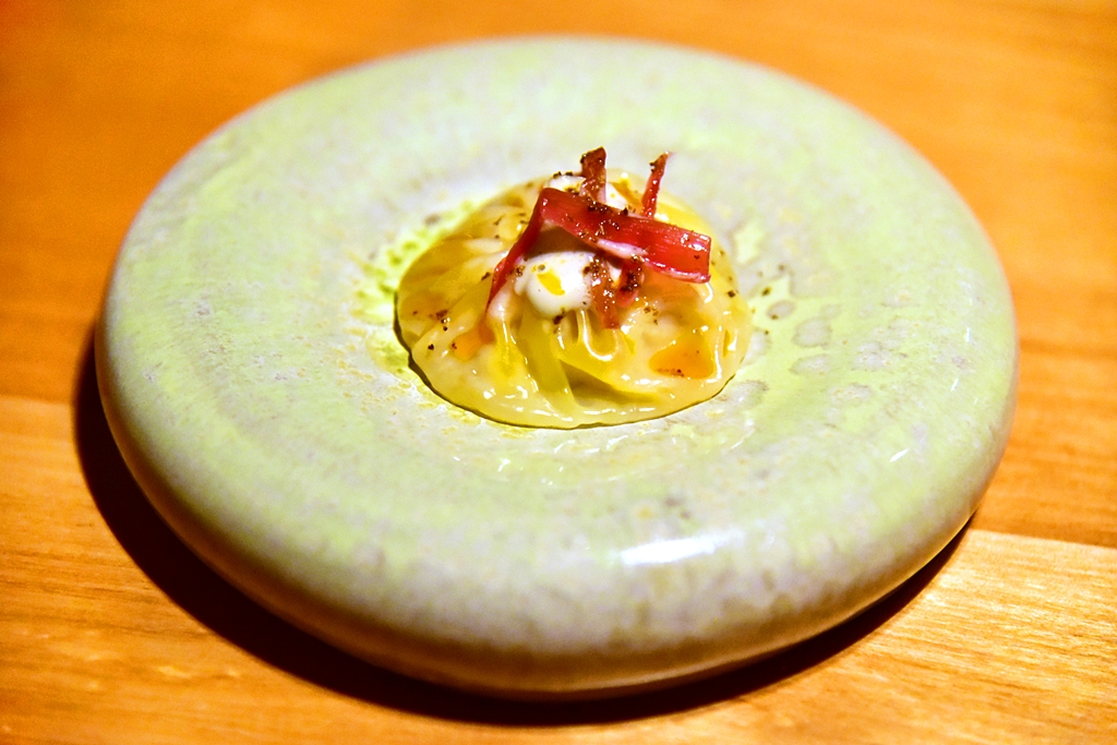 4th course: Cold Tonnarelli with Uni & Green Tomato – พาสต้าเส้นสดเสิร์ฟเย็นคลุกเคล้ากับไข่หอยเม่นหอมๆเสิร์ฟในซุปมะเขือเทศเขียว เป็นเมนูที่แปลกใหม่และอร่อยมาก ไฮไลต์ของมื้อนี้เลย