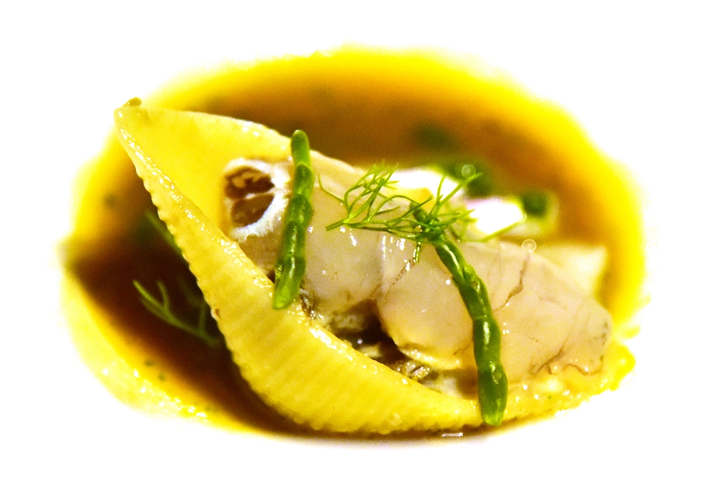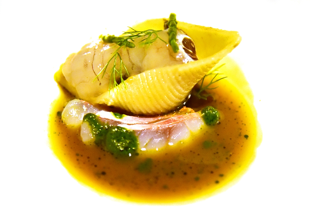 5th course: Conchiglioni with Seafoods – พาสต้ารูปหอยต้มแบบแข็งเสิร์ฟคู่กับเนื้อกั้ง เนื้อปลาและซอสซีฟู้ดรสอูมามิ