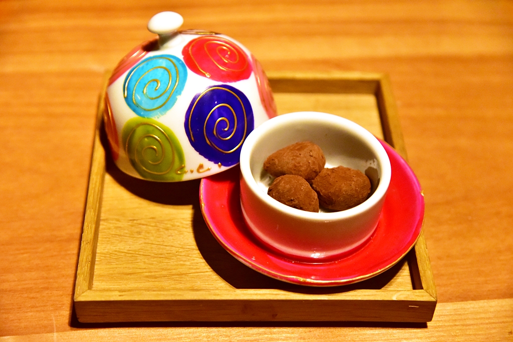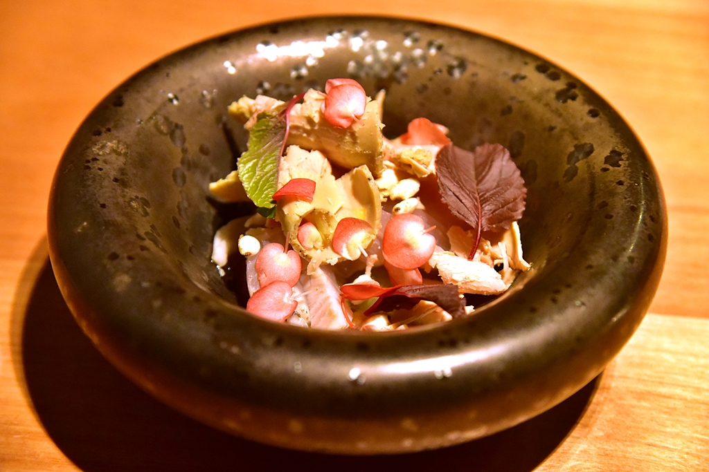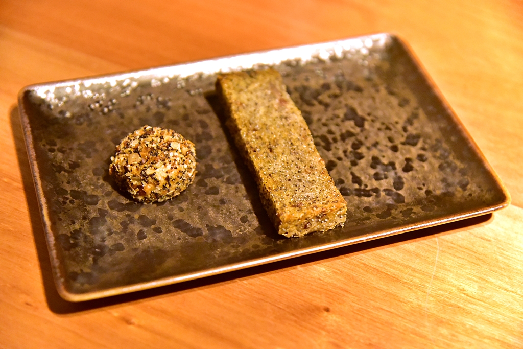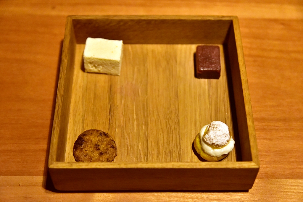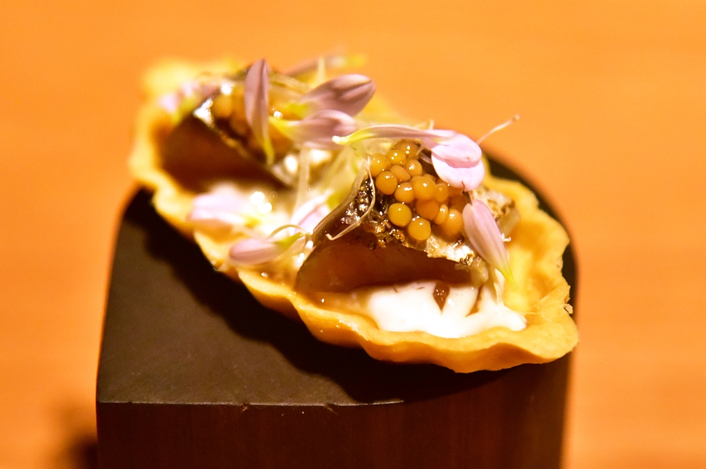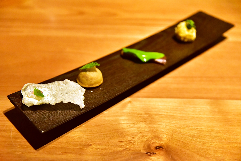 Snacks – เมนูเรียกน้ำย่อยทั้งหมด 5 รายการ ที่ประกอบไปด้วย ทาร์ตปลาแมคเคอเรล ข้าวเกรียบปลาหมึก ขนมสอดไส้มะเขือม่วง กล้วยทรงบุหรี่และครอกเก็ต ทั้ง 5 คำถือว่าอร่อยดีเลย