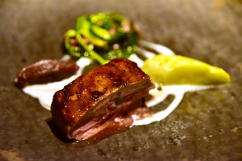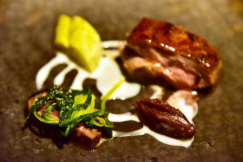 6th course: Lamb & Cucumber with Lamb’s Brain Toast – เนื้อแกะย่างได้หอมนุ่มกำลังดีเสิร์ฟคู่กับแตงกวาย่างพร้อมด้วยขนมปังปิ้งทานคู่กับสมองแกะบดปรุงรส