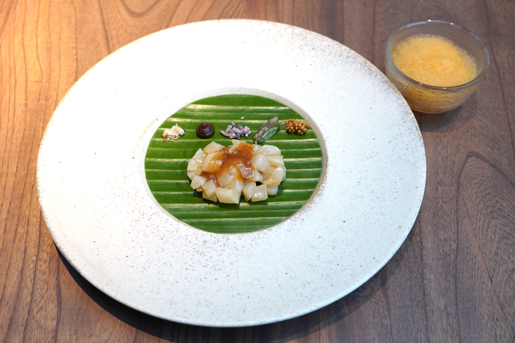 2nd course : SCALLOP [17/20] – เมนูเฉลิมฉลองเทศกาลของรัฐ Kerala ที่ใช้หอยเชลล์เคียวร์กับสาหร่ายเสิร์ฟคู่กับซอสแกง injipuli ที่ทำจากมะขามกับขิงและเครื่องเคียงอีก 5 อย่าง ได้แก่ เกลือมะพร้าว ชัทนีย์มะขามขิง ข้าวพอง ใบเคอร์รีลีฟกรอบและมัสตาร์ดบนใบตองและน้ำซุปมะเขือเทศปลาแห้งเข้มข้น