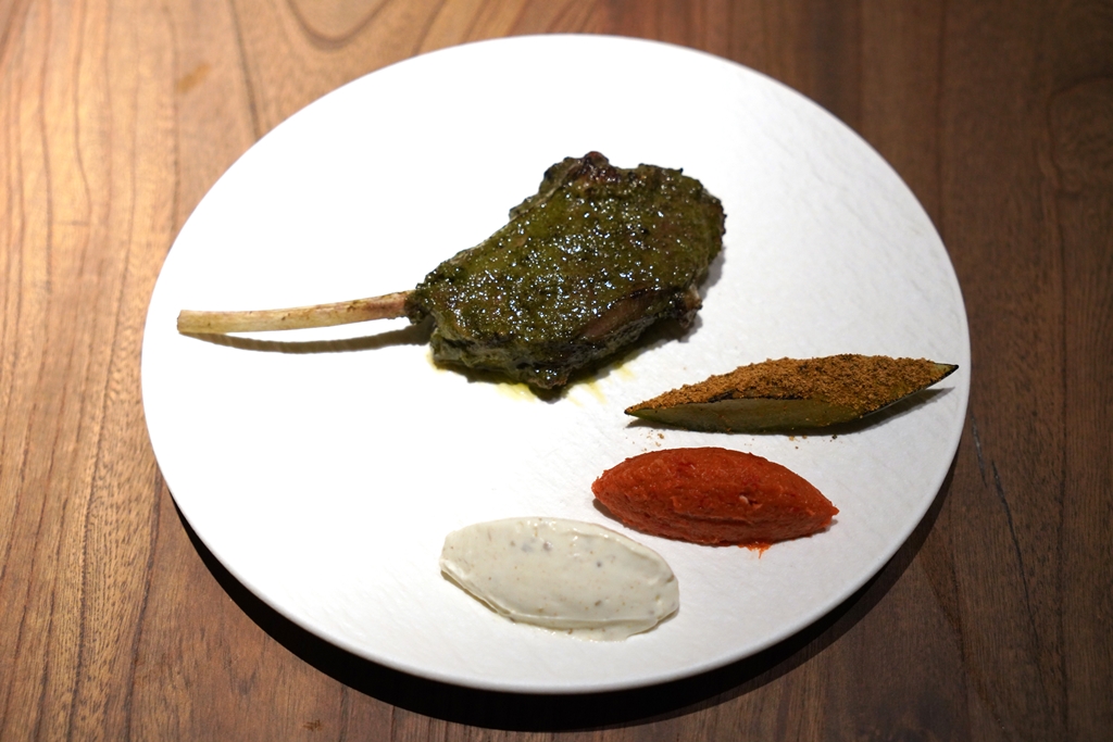 Extra course : LAMB (490++ THB) [16/20] – ซี่โครงแกะย่างแบบสูตรจากรัฐ Himachal ที่เน้นเครื่องแกงสีเขียวจากสมุนไพรสดเสิร์ฟคู่กับโยเกิร์ต รูบาร์บดองและแตงกวาดอง