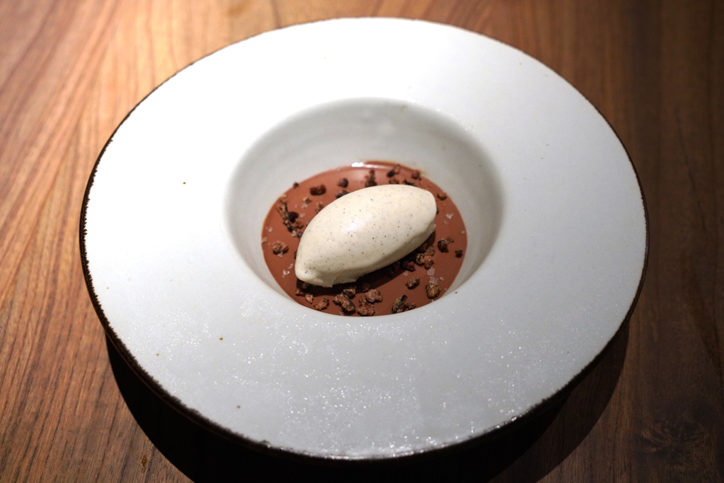 7th course : CHOCOLATE [17/20] – ช็อกโกแลต 65% จากเมือง Puducherry เสิร์ฟคู่กับไอศกรีมวานิลลาแคว้น Malabar โรยหน้าด้วยเกลือทะเลจากเมือง Tuticorin เมนูนี้ถือเป็นเมนูคลาสสิคแบบตะวันตกที่ได้วัตถุดิบทั้งหมดจากประเทศอินเดีย