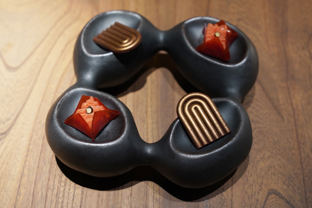 Petit Fours [13/20] – ขนมหวานปิดท้ายมื้ออาหาร 2 อย่าง ได้แก่ มาร์ชเมลโลฝรั่งหน้าพริกไทยและช็อกโกแลตมิ้นต์ไส้บลูเบอร์รี