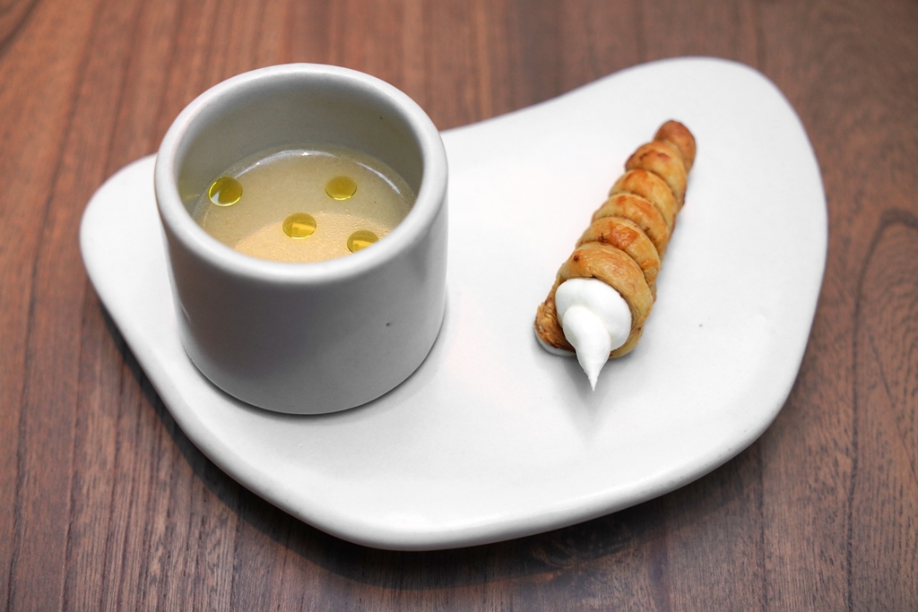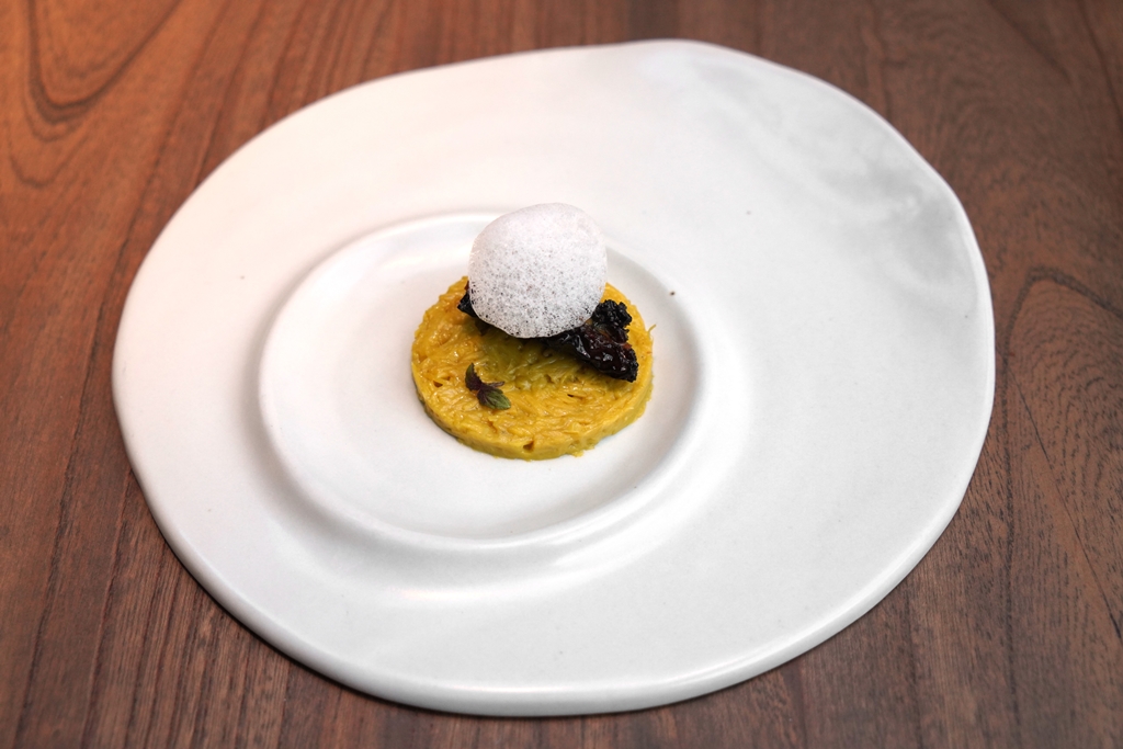 1st course : MOREL [16/20] – เมนูเห็ดจากแคว้น Kashmir ที่ประกอบไปด้วยเห็ดมอเรลยัดไส้ชีสและผลไม้แห้งเสิร์ฟกับเห็ดเข็มทองที่ทำเป็นเมนูเลียนแบบเมนูข้าว pulao และโฟมอัลมอนด์