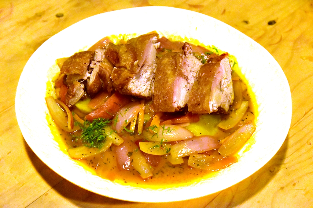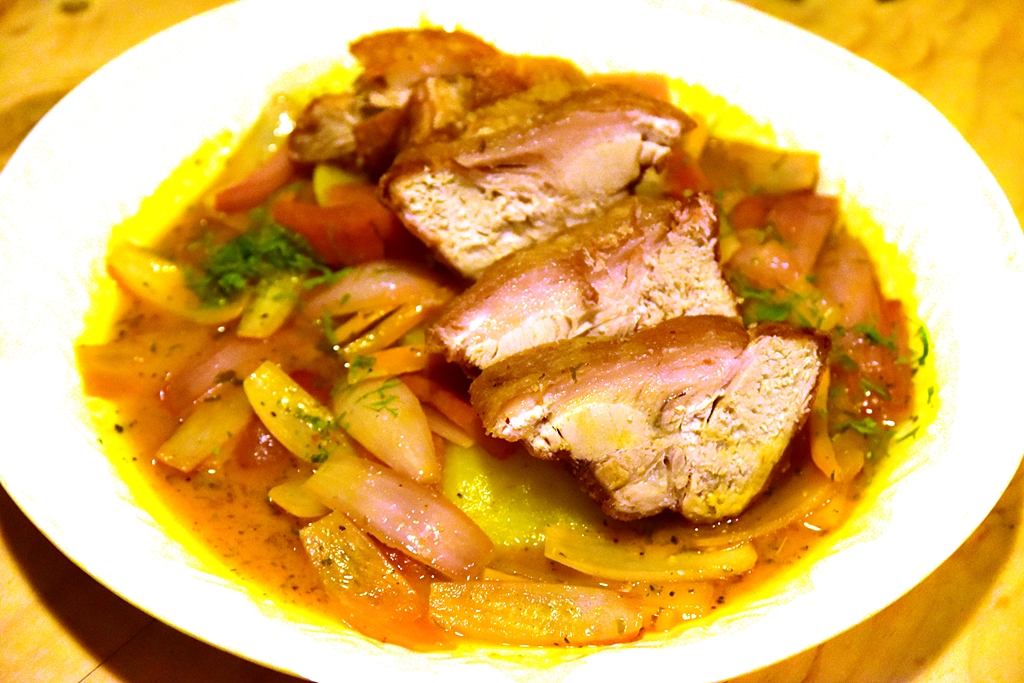 5. Crispy Pork Ribs served with Stir-fried Onions, Tomatoes and Boiled Potatoes (78 Sol) – หมูกรอบชิ้นยักษ์เสิร์ฟกับผัดหอมหัวใหญ่ มะเขือเทศและมันฝรั่ง