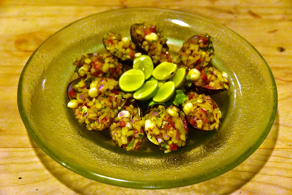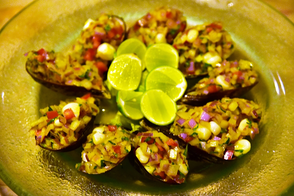 2. Fresh Mussels topped with an Onion, Tomato, Corn and Parsley Brunoise (40 Sol) – หอยแมลงภู่หน้าหอมหัวใหญ่ มะเขือเทศ ข้าวโพส พาร์สลีย์และมะนาวที่รสชาติจัดจ้านสดชื่นมากๆ