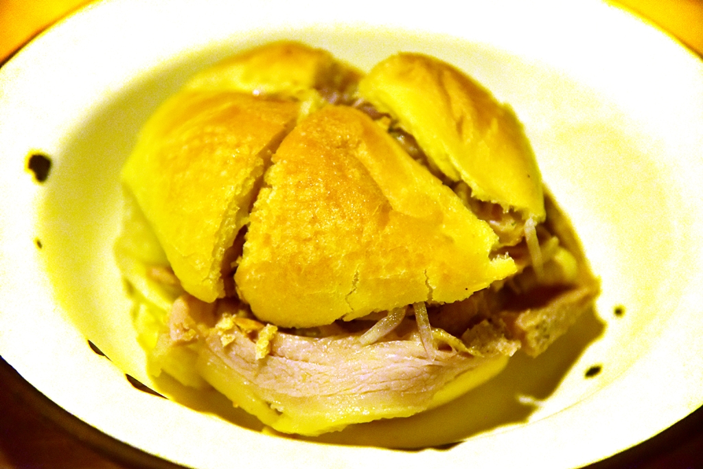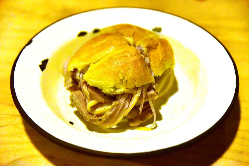 1. Suckling Pig Sandwich (18 Sol) – แซนด์วิชขนมปังอบเนื้อกรอบเบาไส้หมูหันสไตล์เปรูที่ปรุงรสมาได้อย่างดี