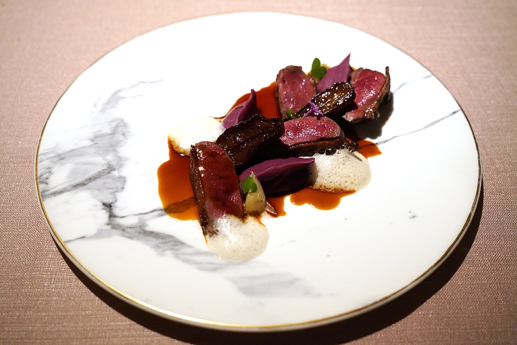 7th course : Pigeon, purple potato, sunchoke, roasted garlic, and lapsang souchong jus [17/20] – นกพิราบแบบ medium rare เนื้อเนียนนุ่มหนังกรอบเค็มเสิร์ฟพร้อมกับพิวรีมันฝรั่งสีม่วง แก่นตะวันและซอสจูซอินฟิวส์กับชาแลปซางซูชอง ถือเป็นเมนูนกพิราบที่ไม่เหม็นเลยและอร่อยมาก