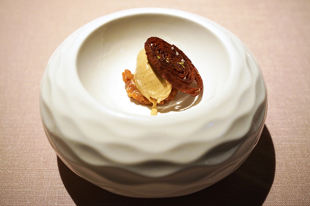 8th course : Pain d’épice, rice and caramel [12/20] – ขนมปังกรอบผสมซินนาม่อนเสิร์ฟพร้อมกับข้าวเหนียวและไอศกรีมคาราเมล เมนูนี้แอบหวานจัดเกินไปหน่อยครับ อยากได้เมนูแบบเย็นๆสดชื่นๆมาตัดของคาวจานก่อนหน้ามากกว่า