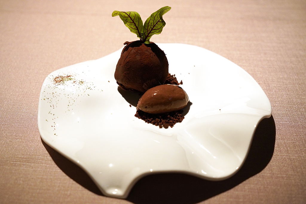9th course : Beetroot, macadamia nut praline, and coffee [13/20] – บีทรูทเคลือบช็อกโกแลตสอดไส้มาสคาโปนและพราลีนถั่วแมคคาดาเมียเสิร์ฟคู่กับมูสช็อกโกแลต เมนูนี้น่ารักมากครับ แต่ส่วนตัวรู้สึกว่ามันหวานมากเกินไป ถ้าลดหวานหน่อยจะชอบมากๆ