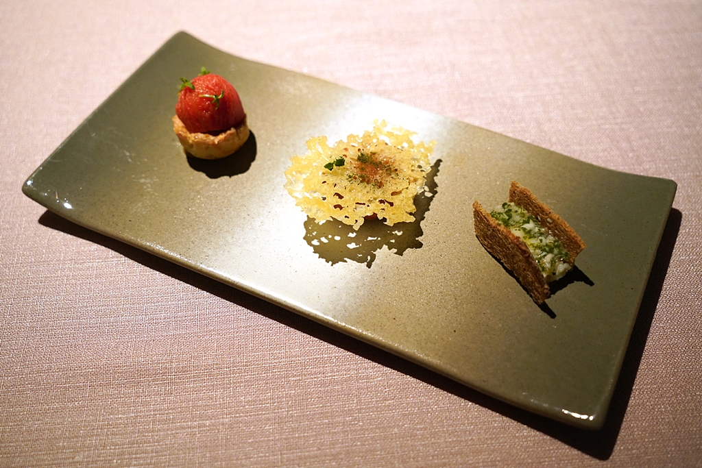 1st course : Canapé selections [15/20] – เมนูเรียกน้ำย่อยแบบคำเล็ก 3 คำ ได้แก่ เจลลี่ซุปซีฟู้ดกระเทียมทานคู่กับขนมปัง พัฟมะเขือม่วงกับชีสทอดและทาร์ตมะเขือเทศกงฟี