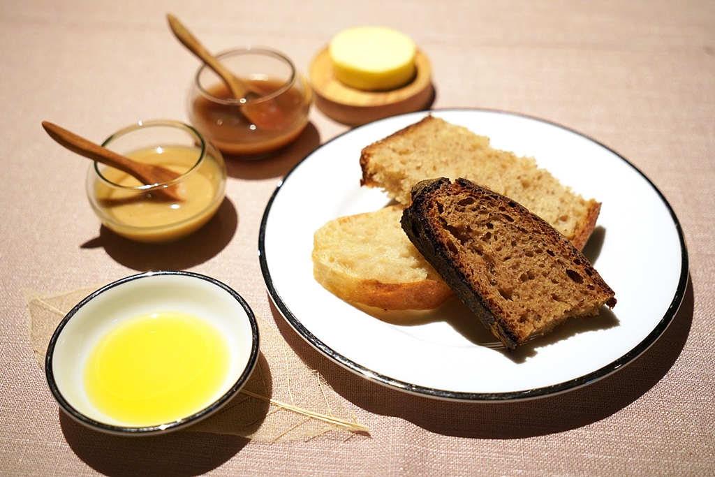 Bread [12/20] – ขนมปังฝรั่งเศส 3 แบบเสิร์ฟพร้อมกับเนยผสมเกลือนำเข้าจากฝรั่งเศส น้ำมันเป็ด สเปรดแมคคาดาเมียและน้ำมันมะกอก