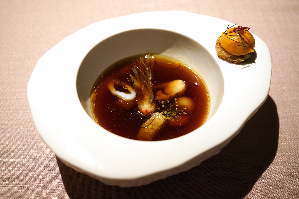 3rd course : Bouillabaisse as a consommé [14/20] – ซุปปลาบุยยาเบสในรูปแบบน้ำใสเสิร์ฟพร้อมกับอาหารทะเลทั้งเนื้อปลา กุ้งและปลาหมึก เสิร์ฟพร้อมกับซอสรูยไข่แดง ตัวซุปรสชาติกลมกล่อม