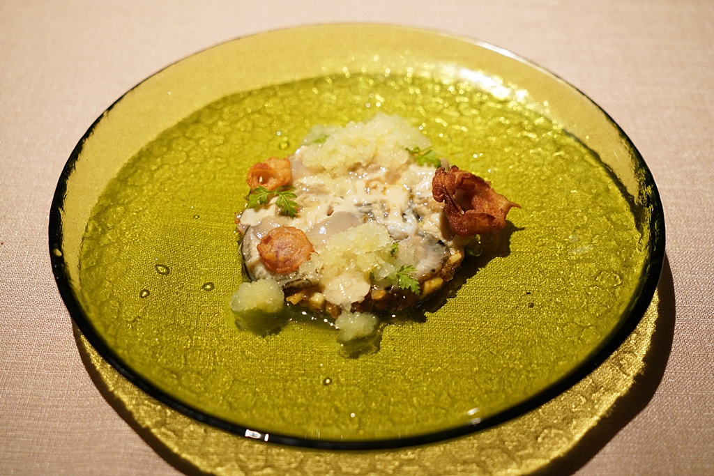 4th course : Gillardeau oysters n°2, green mango and shallot variation [17/20] – หอยนางรมแบรนด์ Gillardeau นำเข้าจากฝรั่งเศสเสิร์ฟพร้อมกับกรานิต้ามะม่วงเขียวผสมน้ำจากหอยนางรมเติมความกรุบกรอบด้วยหอมแดงทอด ถือเป็นเมนูหอยนางรมที่แปลกใหม่ สวยงาม หลากรสสัมผัสและอร่อยมาก !!