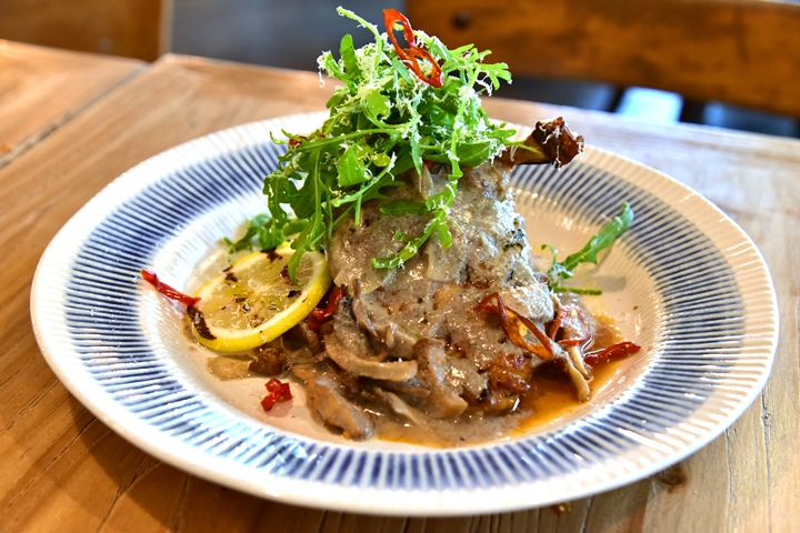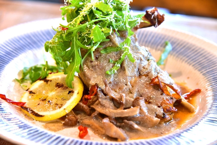 3. Chicken Al Mattone (520++ THB) – สเต็กเนื้อไก่ที่ถูกเลี้ยงในฟาร์มเปิดที่ย่างออกมาได้เนื้อนุ่มสุดๆ เสิร์ฟคู่กับซอสครีมเห็ดป่าและสลัดร็อกเก็ตพาร์มีซานชีส เข้ากันได้ดีมาก