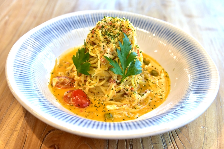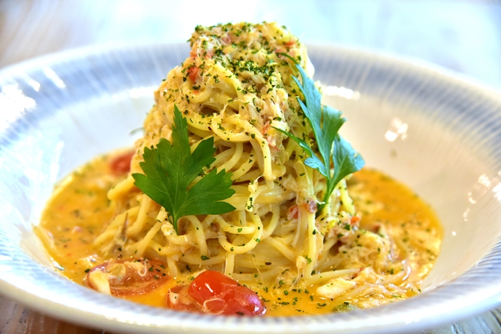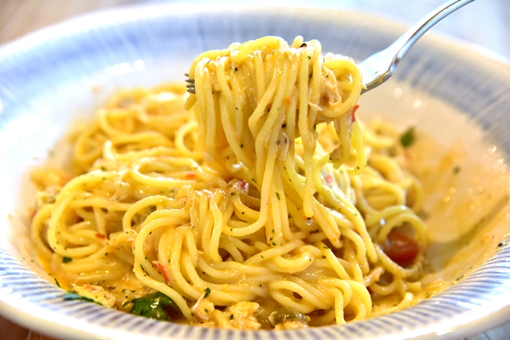 2. Fresh Crab Spaghetti (370++ THB) – สปาเก็ตตี้โฮมเมดเส้นเหนียบนุ่มในซอสเนื้อปู ไวน์ขาว กระเทียม เลม่อน พริกและน้ำมันมะกอกเอ็กตร้าเวอร์จิ้น รสชาตินี่กลมกล่อมหอมหวลมาก ถูกใจมากครับ