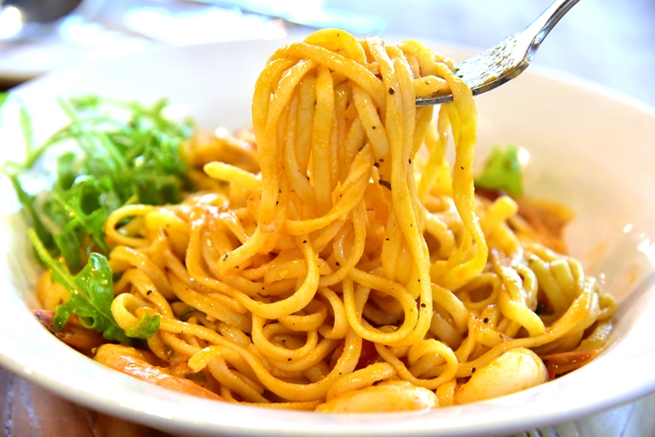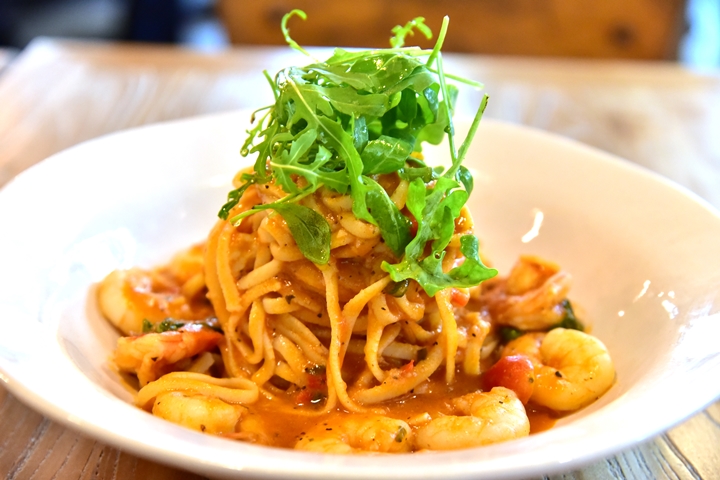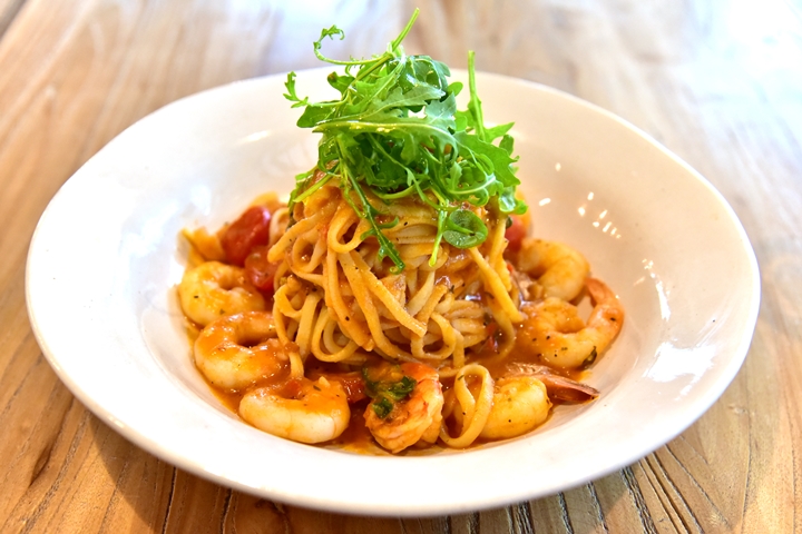 1. Our Prawn Linguine (390++ THB) – ลิงกวินี่โฮมเมดในซอสมะเขือเทศ เฟนเนล ซัฟฟร่อน กระเทียมและพริกรสเปรี้ยวและเผ็ดนิดๆ เสิร์ฟคู่กับผักร็อกเก็ตและกุ้งเนื้อหวานกรอบแบบจุใจ ขอบอกว่าเส้นนี่สุดยอดมากๆ