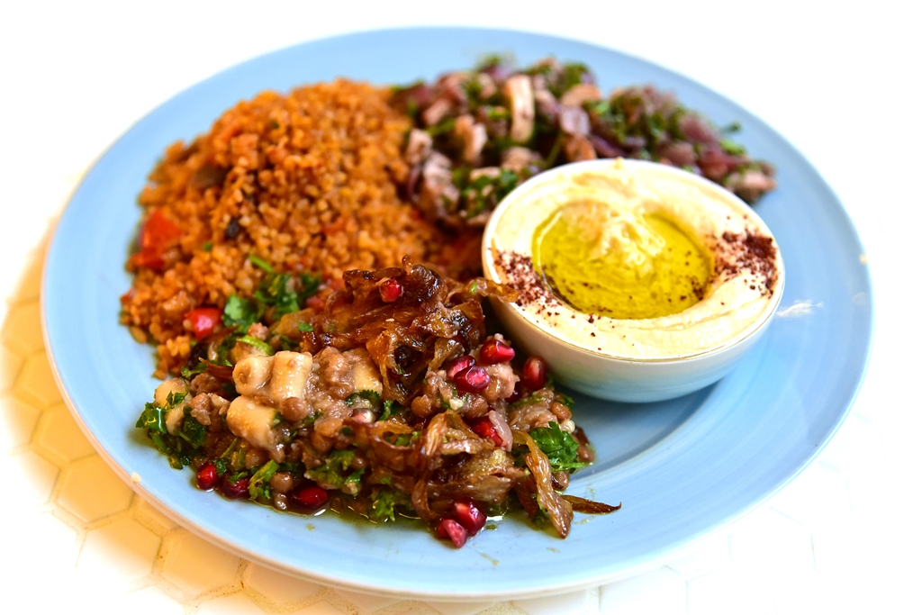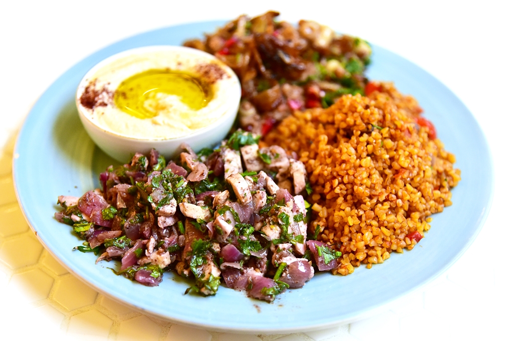 1. Horaa Osbao + Hummus + Tomato Bulgar Wheat + Shredded Chicken Breast with Red Onions (9.7 GBP) – พาสต้าถั่วเลนทิลและอินทผาลัม ฮัมมุส ข้าวสาลีผัดมะเขือเทศและเนื้ออกไก่กับหอมแดง
